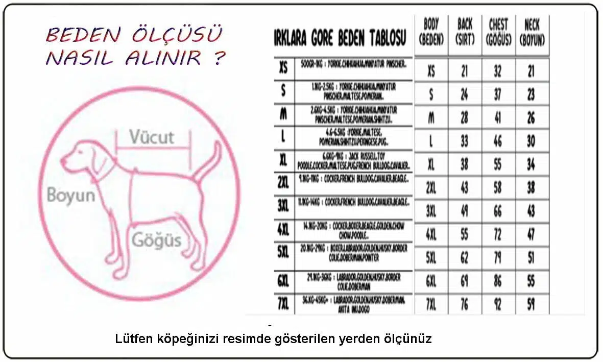 5XLARGE Maksimum 29 Kg Göğüs 79cm Sırt Uzunluk 61-62cm