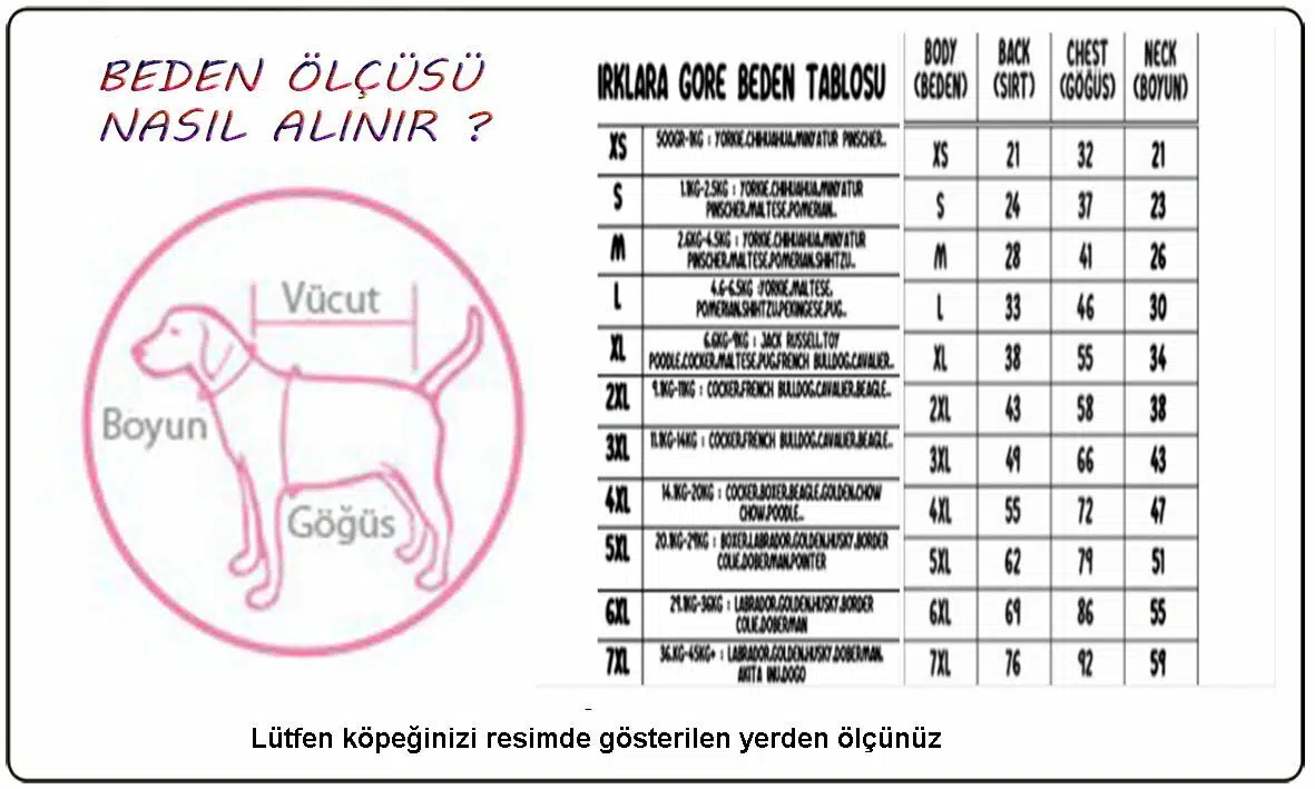 7XLARGE Maksimum 42 Kg Göğüs 92cm Sırt Uzunluk 75-76cm